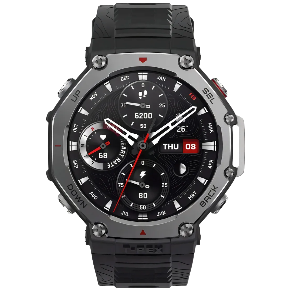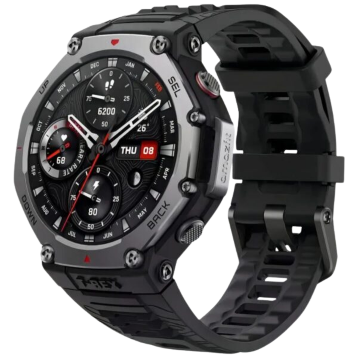 O Amazfit T-Rex 3 apresenta um design robusto e elegante, com caixa de 48,5 mm produzida em aço inoxidável 316L, oferecendo mais durabilidade e resistência para diferentes situações de uso. É um smartwatch pensado para quem procura visual marcante, construção reforçada e confiabilidade no dia a dia e nas aventuras.